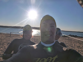 Sunday kept its promise of even warmer weather, and Annmarie and I returned to West Neck Beach for an even more amazing and exhilarating and invigorating late-morning swim as Joye, Carole and Kathy (and the dogs!) watched from the beach. Adopting some of the suggestions of Cold-Warrior Rob Martell, whose recent HUMS blogpost on cold-water swimming is destined to be a Pod classic (http://hums.blogspot.com/2011/11/cold-water-swimming.html), we wore extra "compression" layers under our wetsuits, and were amazed at how much warmer our hands and feet felt with that extra protection for our cores (oh, and my "grande" soy chai tea latte from Starbucks also helped -- not to mention the encouragement from Liz Perlstein, whom I bumped into there!). We stayed in far longer than our initial squeals getting in would have suggested, exchanging exhilarated high-fives when we eventually tore ourselves from the water with a now familiar reluctance that grows more intense with each successive late-season swim....The water is cold, and getting colder, and our open-water swims grow increasingly symbolic as their length and distance wane....